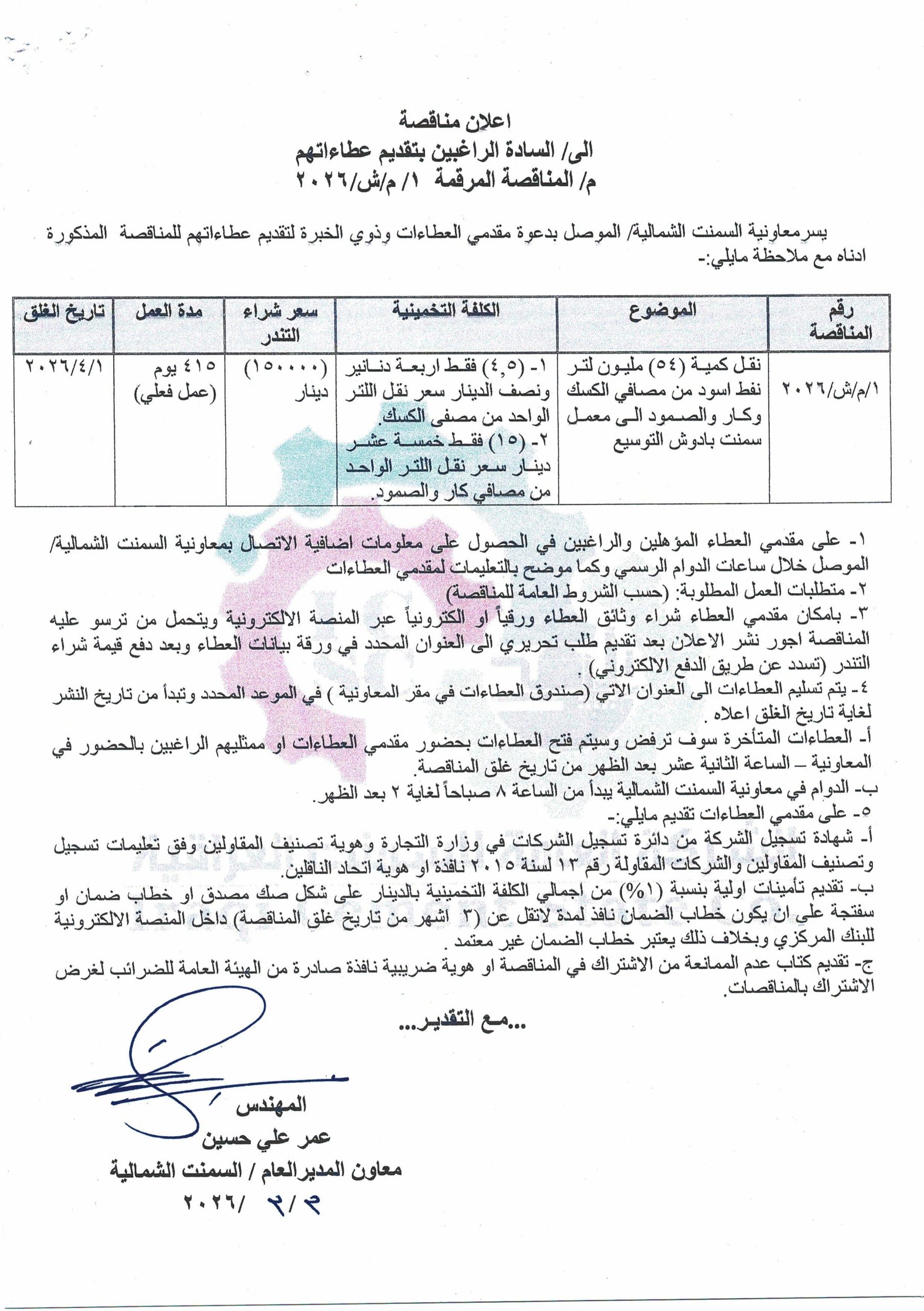 نقل كمية ( 54 ) مليون لتر نفط اسود من مصافي الكسك وكار والصمود الى معمل سمنت بادوش التوسيع معاونية السمنت الشمالية